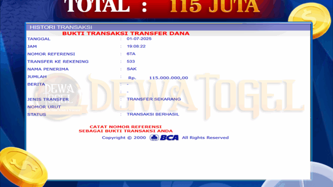 DEWATOGEL mengucapkan selamat kepada user id : JKJ*** yang telah berhasil mendapatkan jackpot pada permainan TOGEL DI CAROLINA 4D. Kemenangan sebesar Rp 93.000.000,-. telah dibayarkan LUNAS oleh pihak dewatogel kepada pemilik user id setelah yang bersangkutan mengisi formulir withdraw. Proses pencairan dana berlangsung sangat cepat hanya dalam waktu 5-10 menit sudah berada dalam rekening pemilik user id. Bukti transfer yang dapat anda lihat adalah bukti SAH / VALID yang langsung di dapatkan melalui bukti transaksi dari Bank yang digunakan untuk pengiriman dana pada rekening pemilik user id. Terima kasih kami sampaikan kepada para pengguna setia DEWATOGEL yang telah menggunakan situs kami, sebagai Bandar Terpercaya yang pastinya membayar semua kemenangan member hingga lunas. Apakah DEWATOGEL PENIPU ? Reputasi “DEWATOGEL TERPERCAYA” sudah sangat melekat. puluhan hingga ratusan ribu pengguna setia DEWATOGEL tetap menggunakan situs terbesar dan terbaik di Indonesia ini. Hapus rasa was-was dan khawatir anda, kemenangan anda berapapun PASTI dibayarkan hingga lunas.