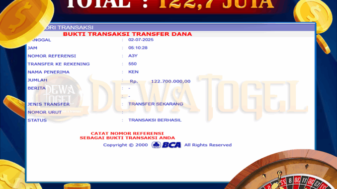 DEWATOGEL mengucapkan selamat kepada user id : SOI*** yang telah berhasil mendapatkan jackpot pada permainan LIVE CASINO DI SICBO DICE. Kemenangan sebesar Rp 159.750.000,-. telah dibayarkan LUNAS oleh pihak dewatogel kepada pemilik user id setelah yang bersangkutan mengisi formulir withdraw. Proses pencairan dana berlangsung sangat cepat hanya dalam waktu 5-10 menit sudah berada dalam rekening pemilik user id. Bukti transfer yang dapat anda lihat adalah bukti SAH / VALID yang langsung di dapatkan melalui bukti transaksi dari Bank yang digunakan untuk pengiriman dana pada rekening pemilik user id. Terima kasih kami sampaikan kepada para pengguna setia DEWATOGEL yang telah menggunakan situs kami, sebagai Bandar Terpercaya yang pastinya membayar semua kemenangan member hingga lunas. Apakah DEWATOGEL PENIPU ? Reputasi “DEWATOGEL TERPERCAYA” sudah sangat melekat. puluhan hingga ratusan ribu pengguna setia DEWATOGEL tetap menggunakan situs terbesar dan terbaik di Indonesia ini. Hapus rasa was-was dan khawatir anda, kemenangan anda berapapun PASTI dibayarkan hingga lunas.